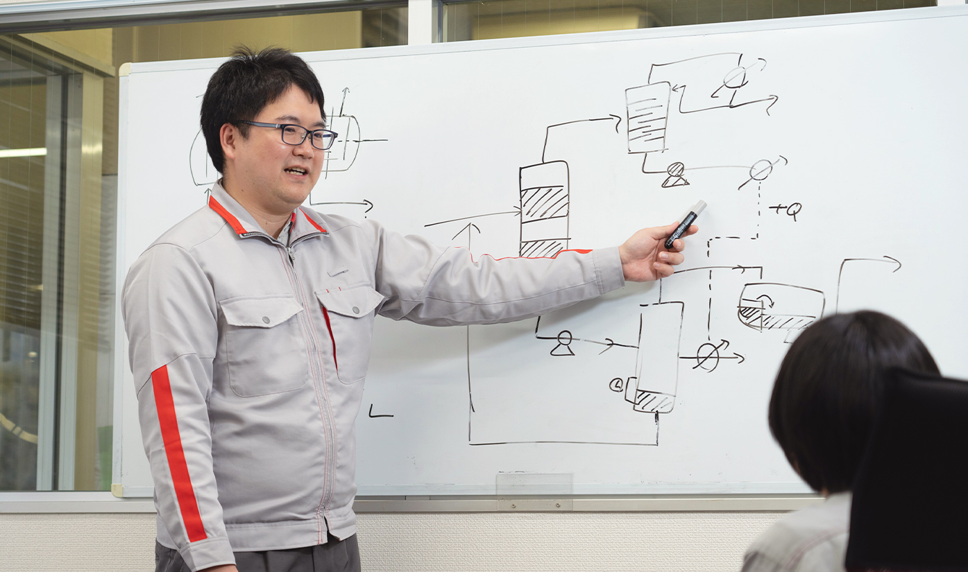 プロセスシミュレーションソフト等を使用し、製造プラントの増産や省エネに向けた生産プロセス設計を担当しています。省エネ検討では、最小のエネルギーで生産するために、ソフト上で計算した結果を実際のプラントに導入し、製品の品質に影響がないか、期待する省エネ効果が得られるかなどの見極めを行っています。製造担当者とのやり取りの中で、これまでの経験や知見が解決の手掛かりになることもあり、周囲の協力を得ながら、改善に向けて取り組んでいます。